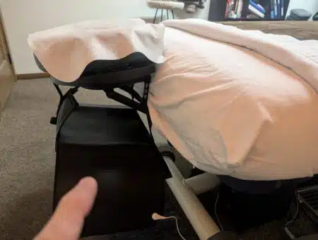 Me pointing to the grounding mat which fits nicely on the tables arm rest.